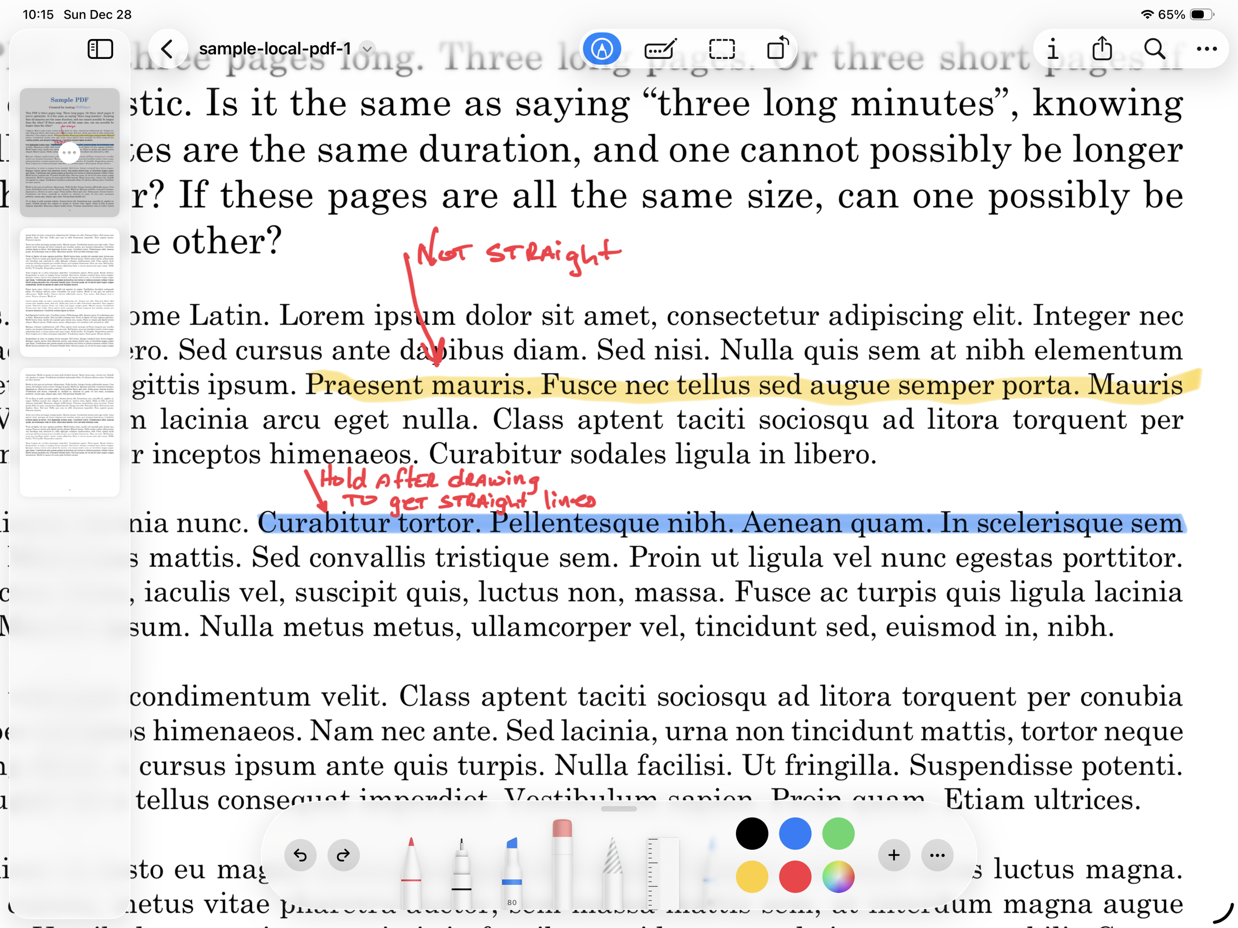 This is where the Apple Pencil really shines. It give you more precise control for placing your highlights, and feels like working with a real document. If drawing a straight line is a challenge for you (like it is for me), just pause, while holding the pencil on the screen at the end of your line, and it will automatically get straightened out on the page. Very handy.