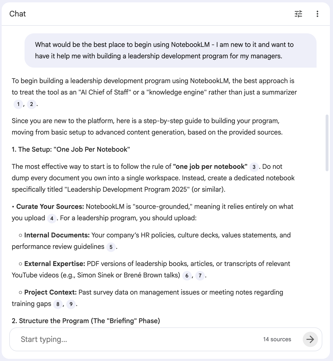 This is great for leaders because it virtually eliminates the risk of "weird things" being made up. You can be confident that the information is accurate because you gave the AI the data yourself. It allows you to stay focused on one subject or one project without the "noise" of a broad spectrum of information. Plus, as you ask questions of your sources, when you get a response, it will provide links and references to the source information. That way you can both verify the information, and learn more (in context) related to what your prompt was about.